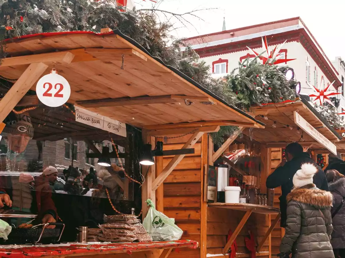 Wooden huts containing festive foods and strung with decorations are much like the classic log cabins found throughout the mountains and Quebec woodlands.