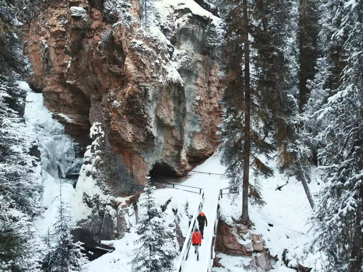 In summer, Johnston Canyon is one of Banff's most popular hikes. In winter, it becomes something else altogether. As temperatures fall, the canyon's waterfalls freeze — massive, pale blue columns of ice stopped mid-cascade — and guided tours lead small groups along the canyon trails to see them up close.