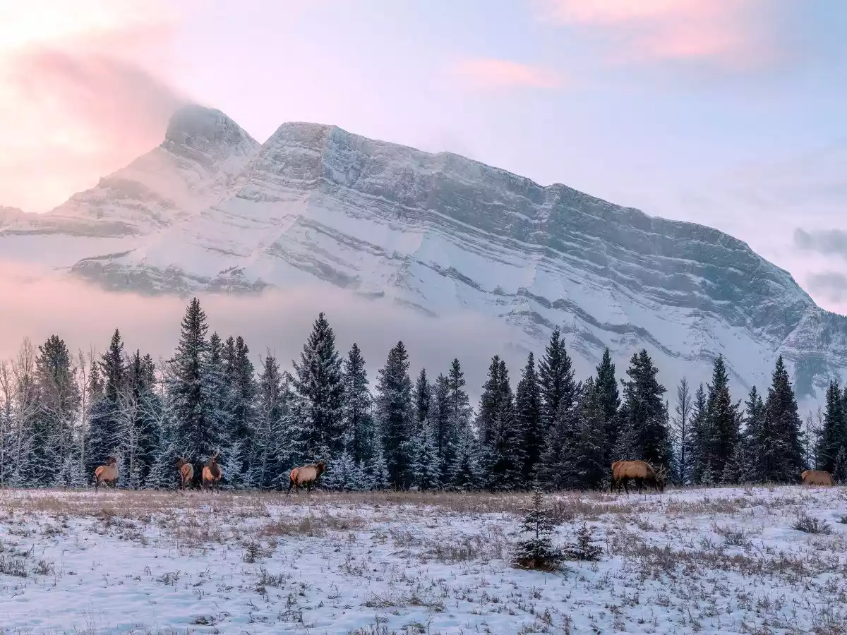 Grizzly and black bears might have begun hibernating, but winter in Banff National Park brings its own remarkable wildlife activity. Against the white backdrop of snowy forests, elk, moose, and coyotes become far more visible than they are in the summer months as they move through valleys and along the riverbanks in search of food.